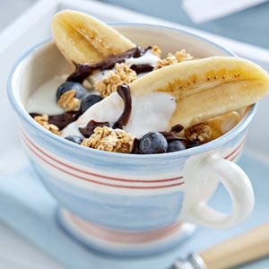 Λιώνουμε τη σοκολάτα σε μπεν μαρί, ή στο φούρνο μικροκυμάτων.Σε ένα μπολ τοποθετούμε 2 κομμάτια μπανάνας. Ρίχνουμε και το γιαούρτι, περιχύνουμε με την λιωμένη σοκολάτα και πασπαλίζουμε με τα δημητριακά.
